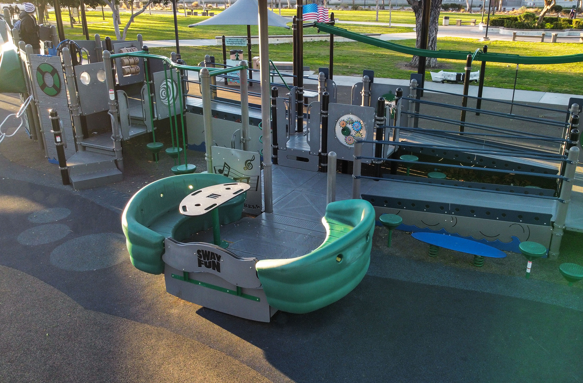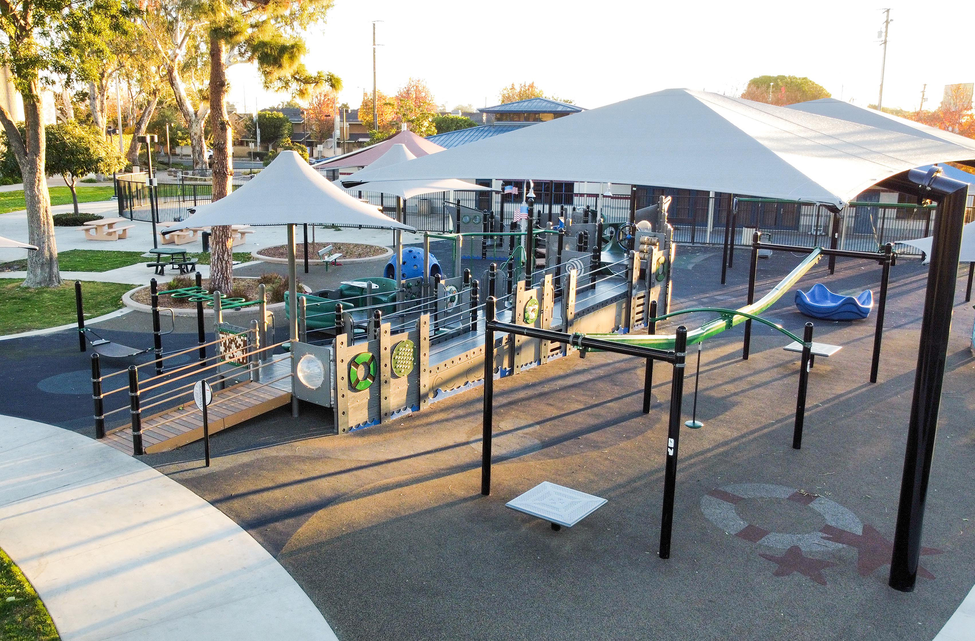 Honoring Rear Admiral Isaac C. Kidd, USN, this playground offers the kids of Long Beach a fun naval-themed play experience with two “ship” play structures “docked” and ready for some imaginative play time with friends. A Cozy Dome® near the smaller play ship gives younger kids a hideaway spot where they can view the activities through port holes and then race each other to the top. The larger play ship features ramped access to a Sway Fun® Glider “dinghy” for added inclusive play for all abilities. A Boogie Board™ and custom Surfboard Wobble Pod® Bouncer to the side of the ship lets kids ride the waves in unique ways. The 34’ ZipKrooz® zipline rider and OmniSpin® Spinner add further excitement to the playground. The swing set has something for everyone with three seat options. Bench seating provides restful spots for parents and caretakers. And there’s plenty of shade to help keep this Long Beach “port” safer from the sun’s rays. All aboard!