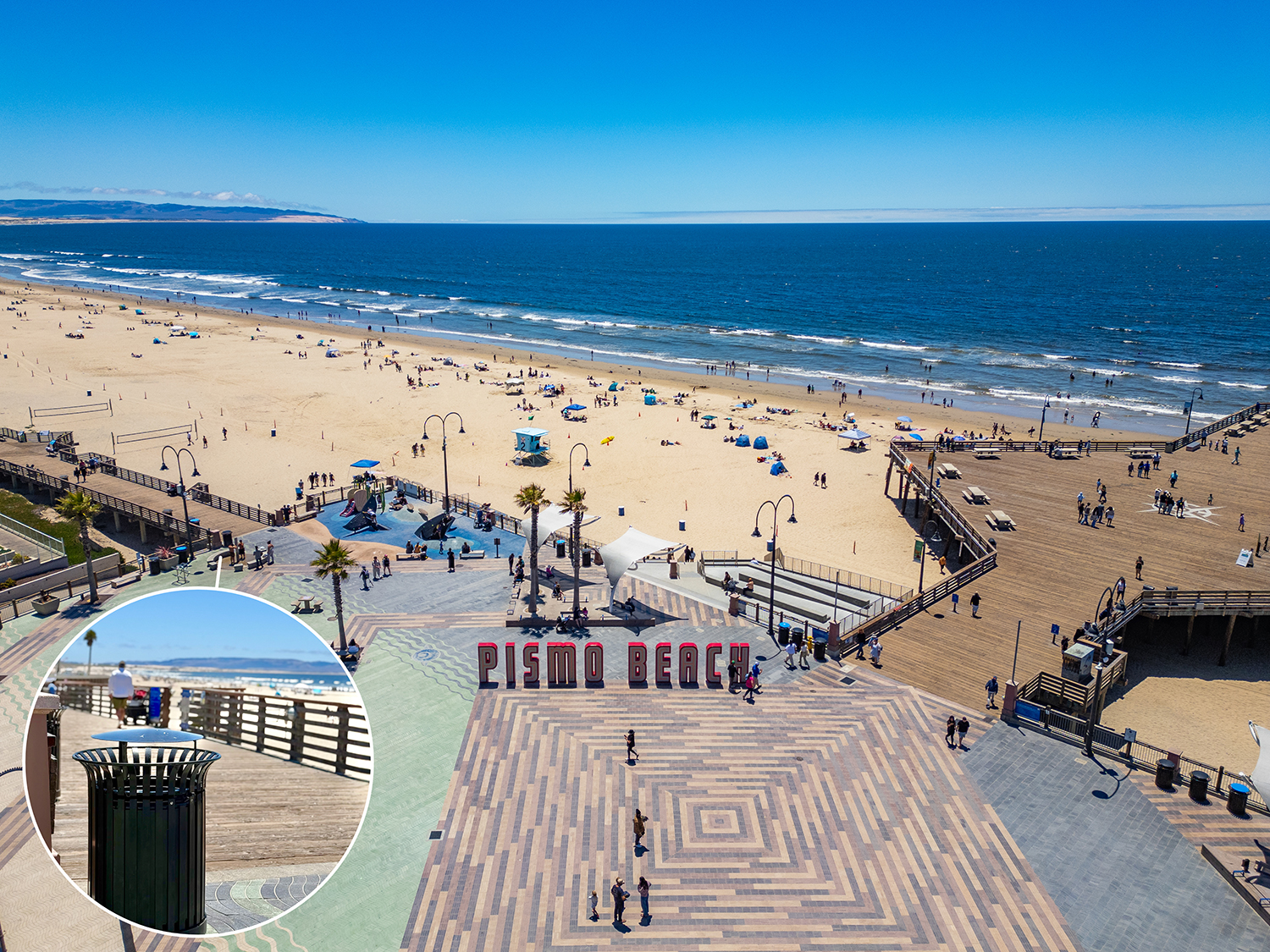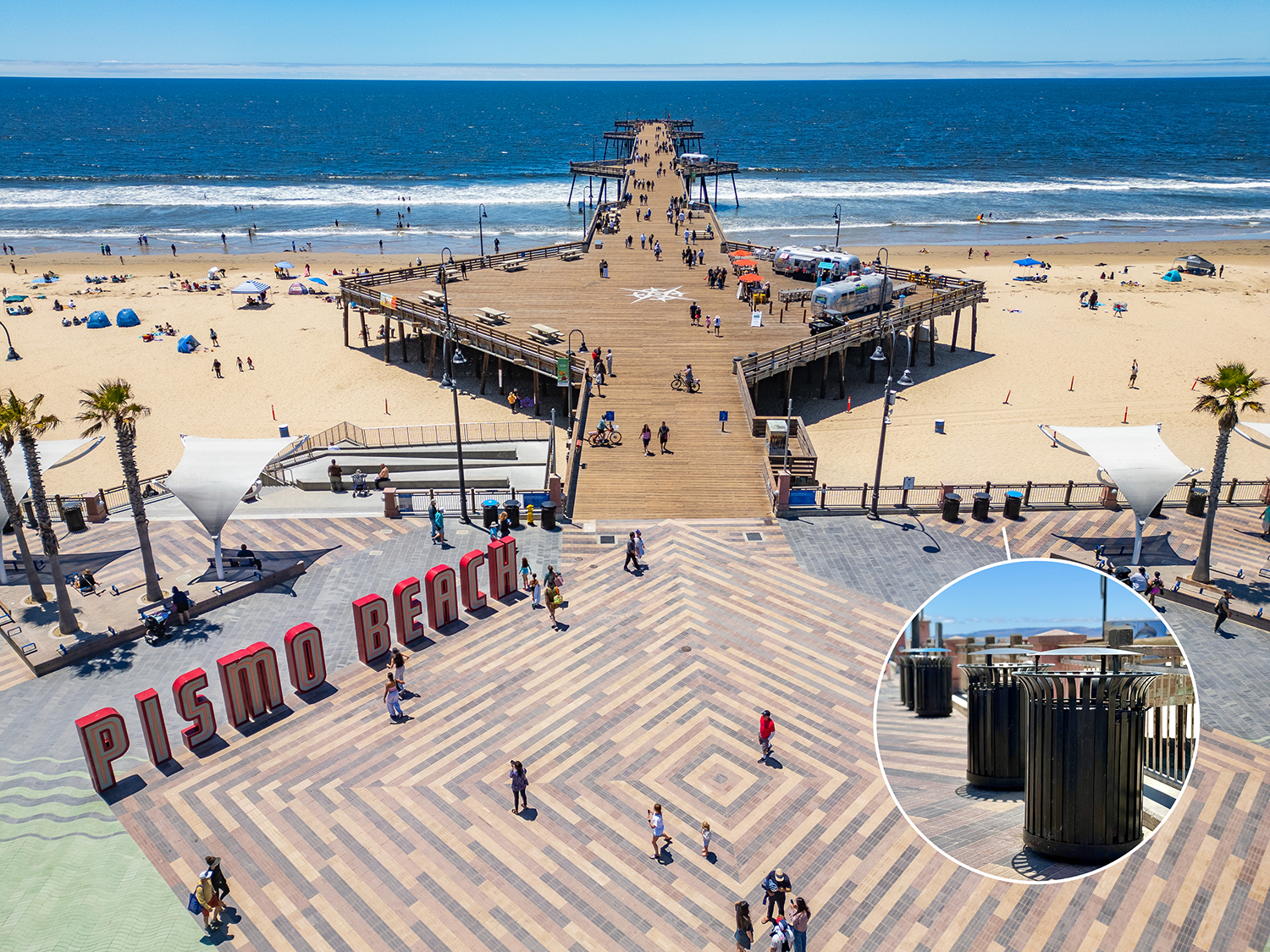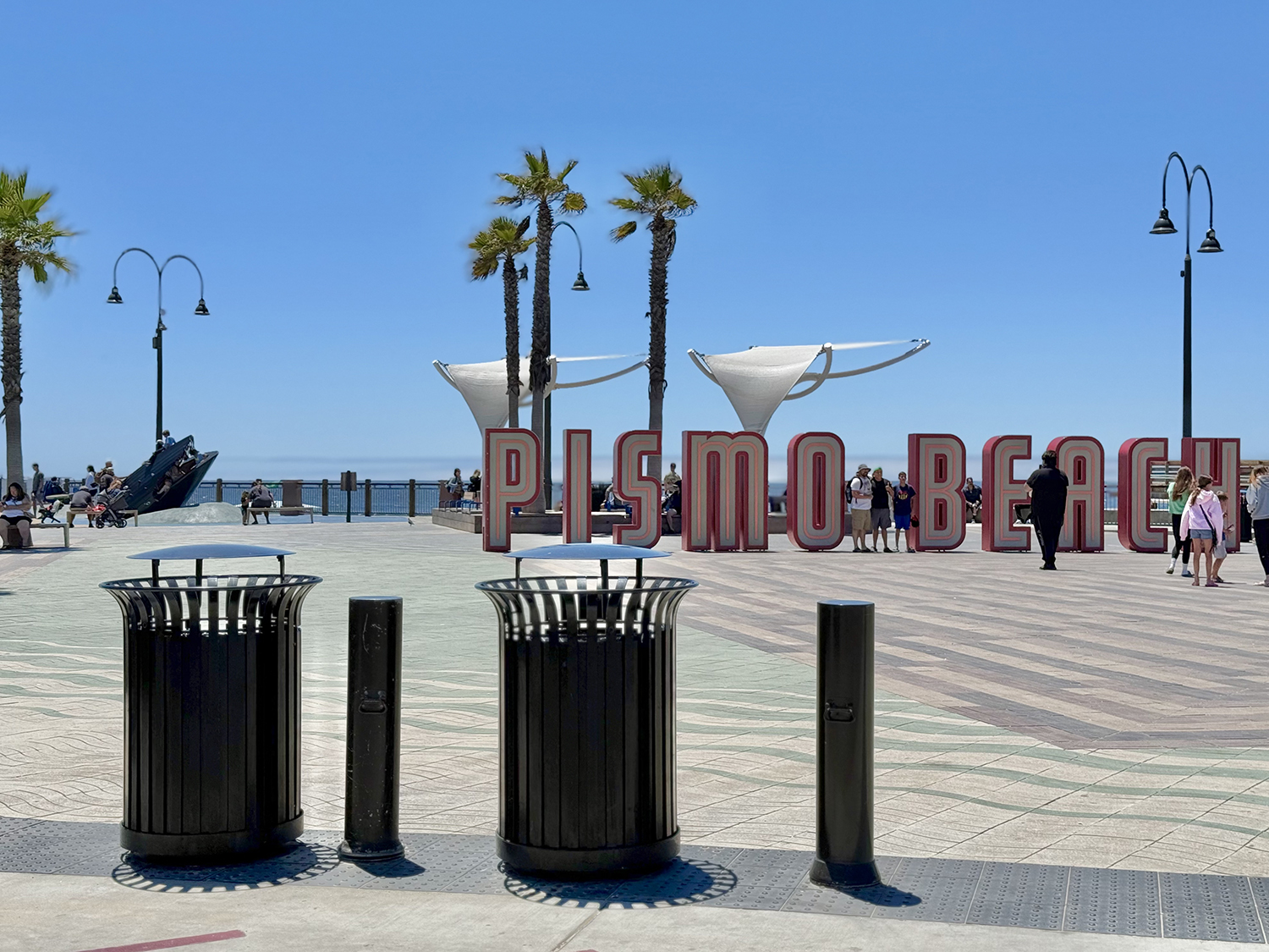 The City of Pismo Beach project includes DuMor’s 157 32-gallon steel slat receptacles with side-door access and a 25-inch bonnet cover. This design provides a practical and durable waste solution while maintaining a clean appearance suitable for a coastal environment.