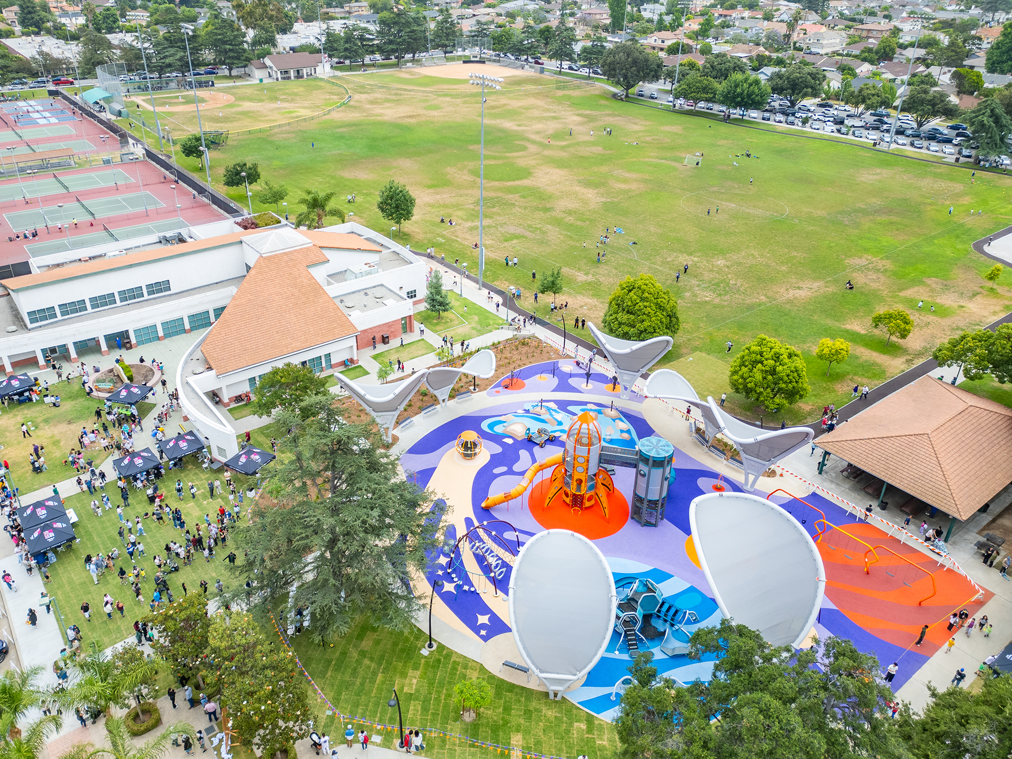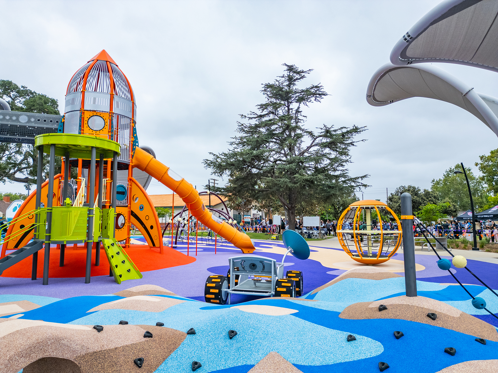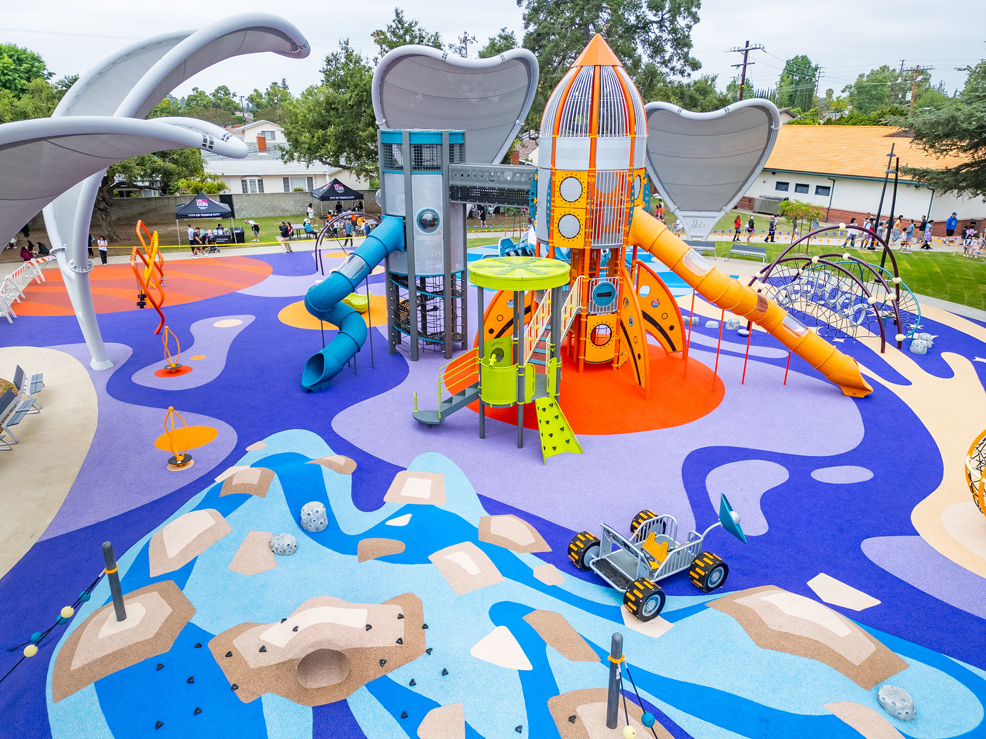 Our team at Landscape Structures designed the play space around massive Central Rocket Ship and Command Station Towers that paid homage to a historic Rocket Ship play structure that was at the park previously. From there, we packed the surrounding area with themed play elements, including Moon Rock mounds, Moon Rover, a space-themed 2-5 play structure, Global Motion Spinner and so much more!