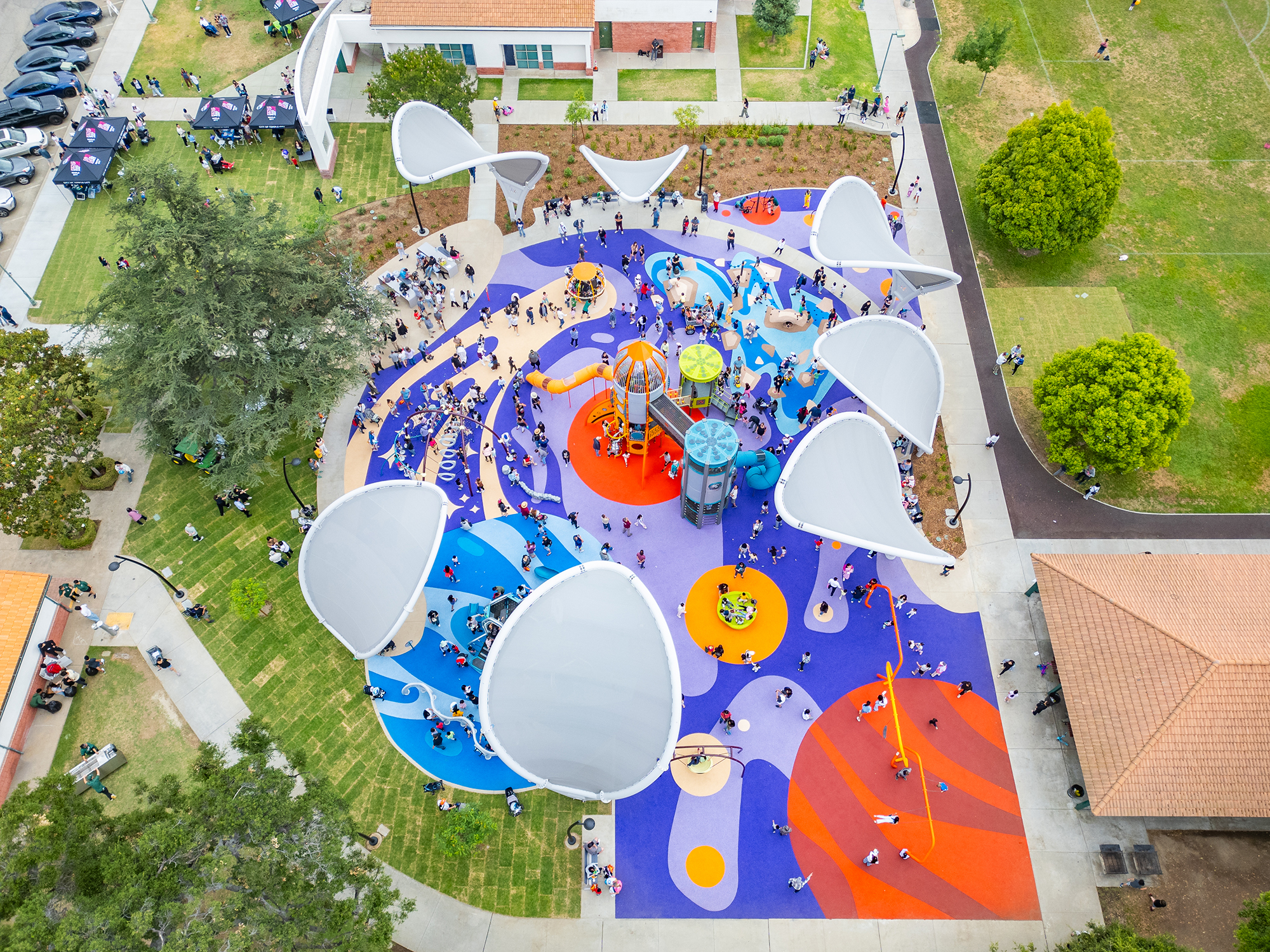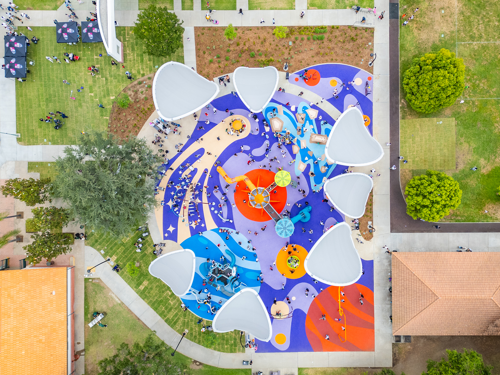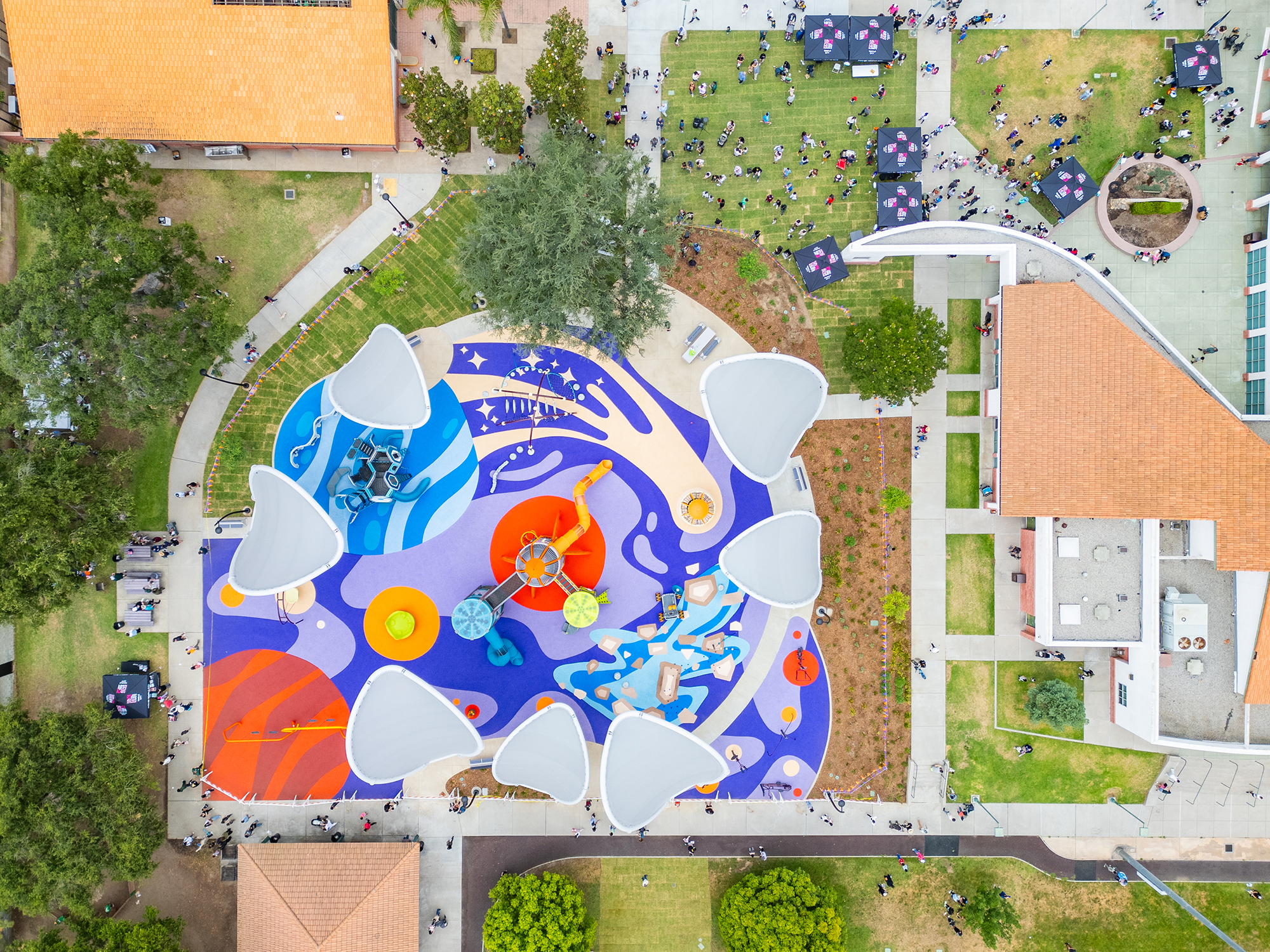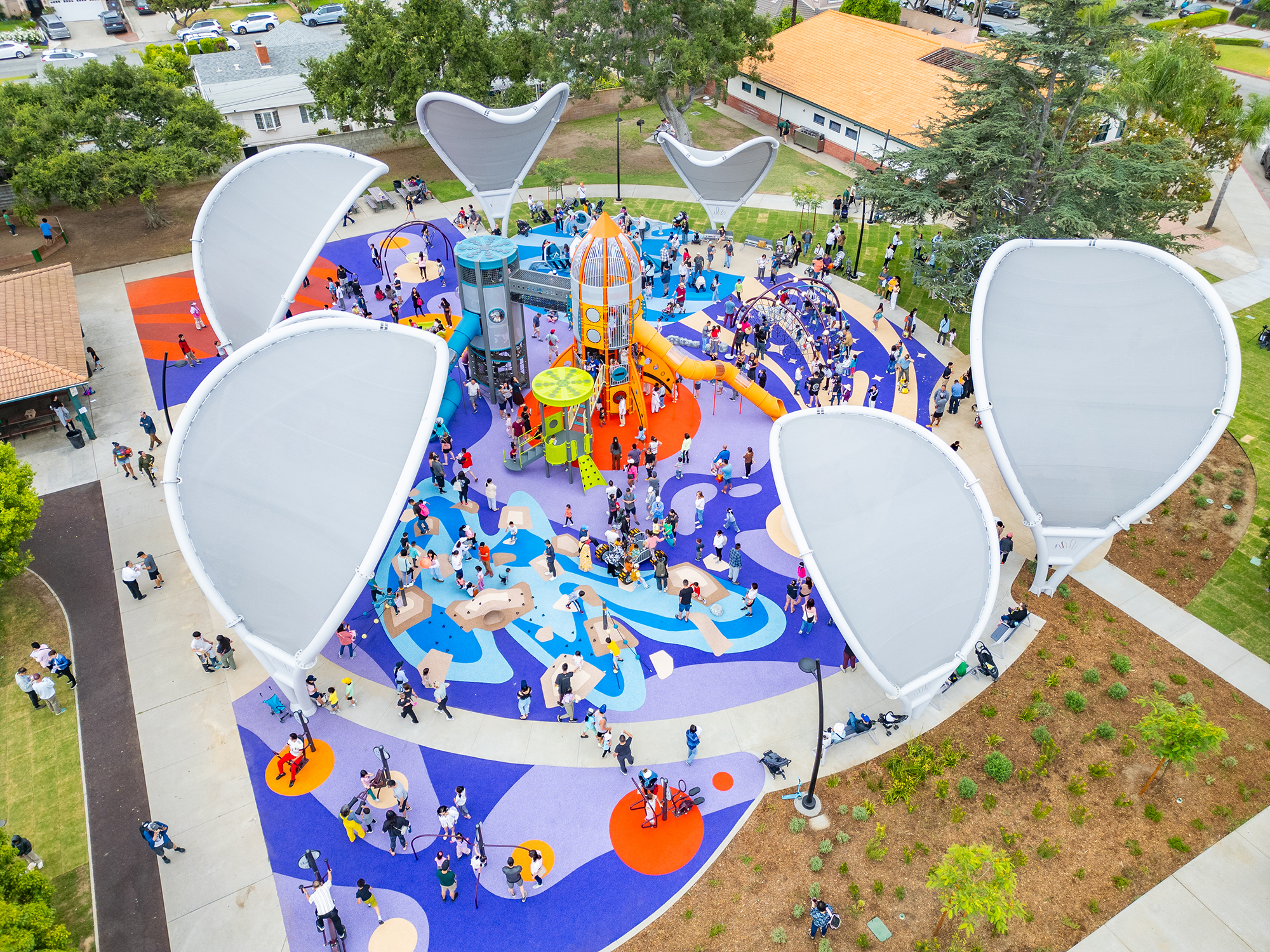 Our team at Landscape Structures designed the play space around massive Central Rocket Ship and Command Station Towers that paid homage to a historic Rocket Ship play structure that was at the park previously. From there, we packed the surrounding area with themed play elements, including Moon Rock mounds, Moon Rover, a space-themed 2-5 play structure, Global Motion Spinner and so much more!
