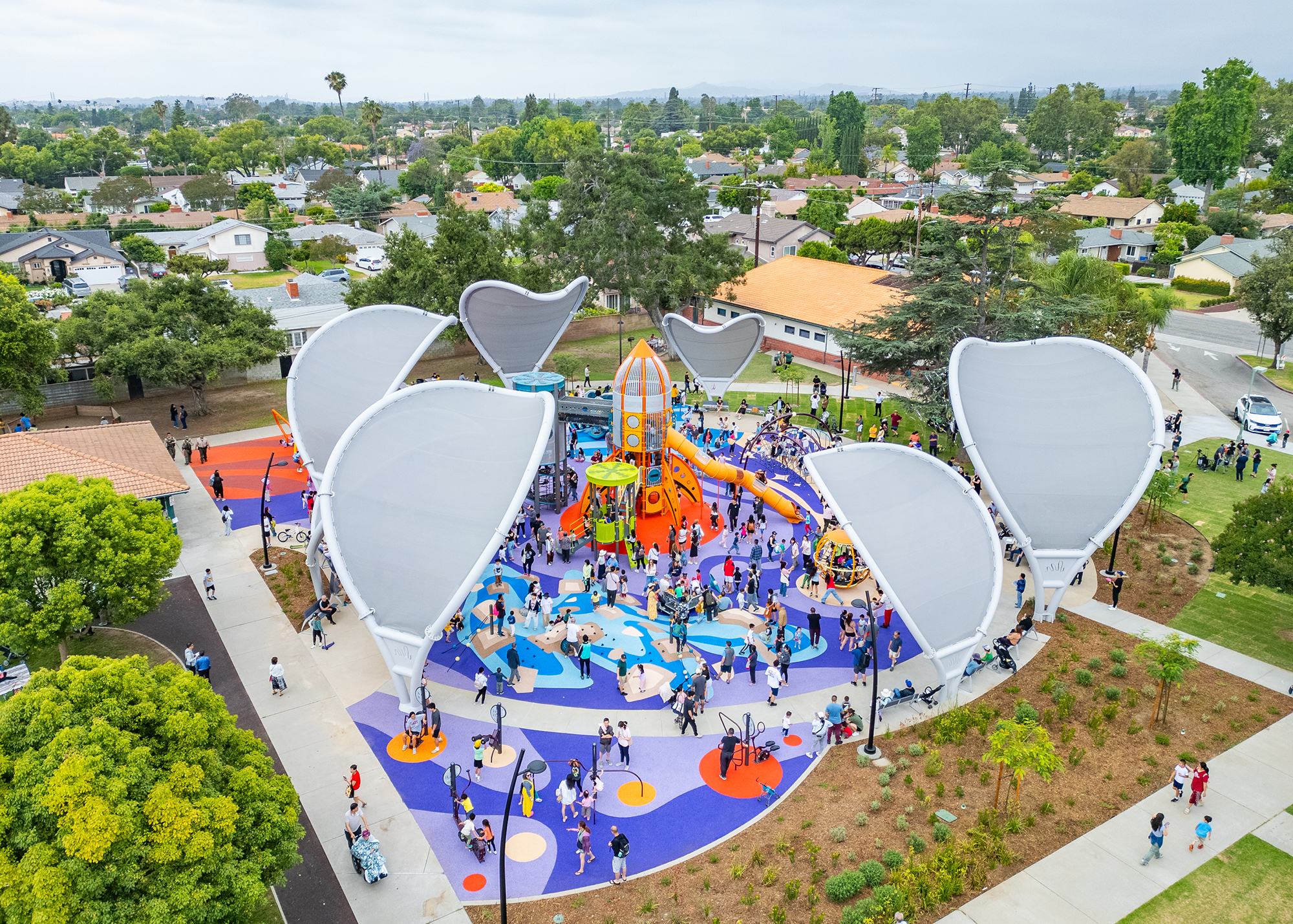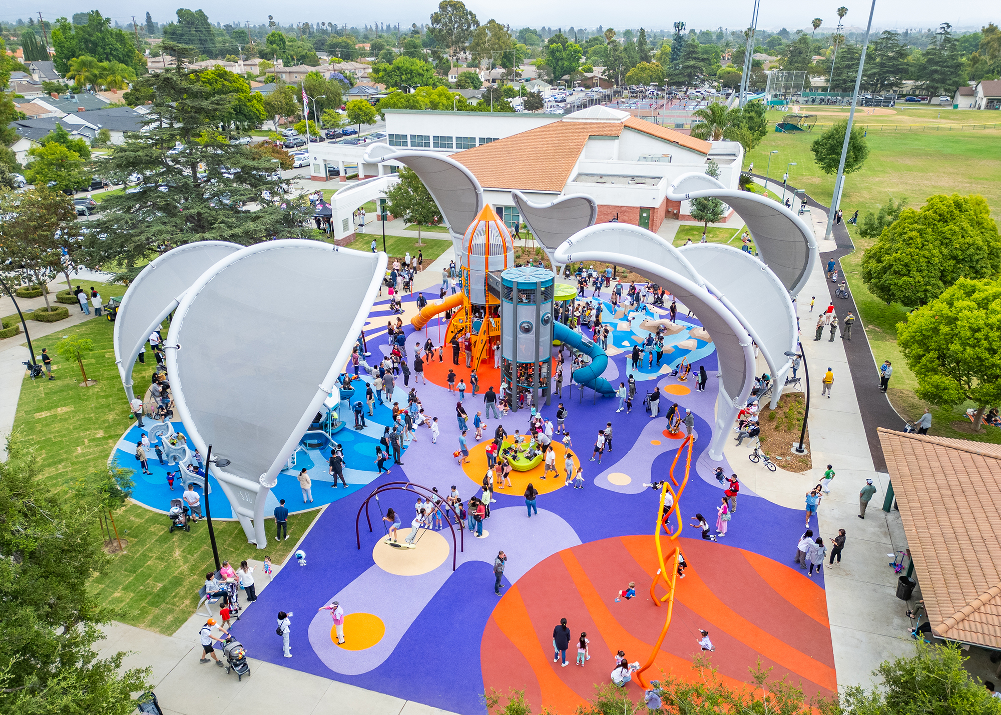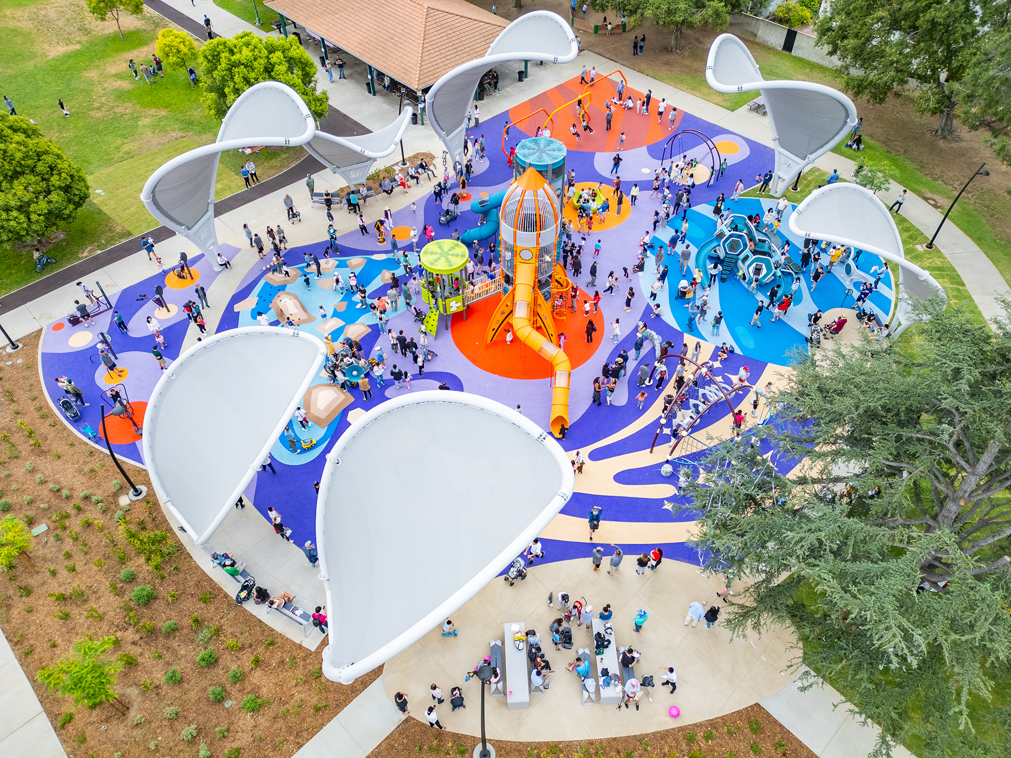 The 30′ tall cloud-like shade structures from SkyWays by Landscape Structures that encompass the playground from all sides might be the most iconic part of the whole park!
