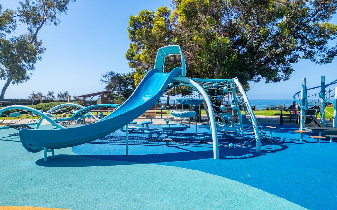 An intricate play structure with a blue and white color scheme and an ocean theme.
